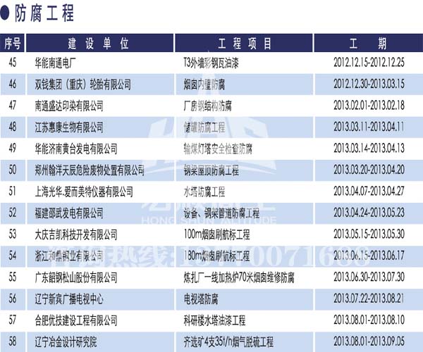 宏順建設(shè)工程有限公司是國(guó)家批準(zhǔn)成立的專業(yè)高空作業(yè)企業(yè):承攬過(guò)(國(guó)內(nèi).國(guó)外)煙囪新建、煙囪防腐、吊機(jī)防腐、水塔防腐、管道防腐、龍門吊防腐、儲(chǔ)存罐防腐、煙囪內(nèi)壁防腐等高空作業(yè)工程。具有“不搭腳手架 、 不需要停產(chǎn)”施工特點(diǎn)。